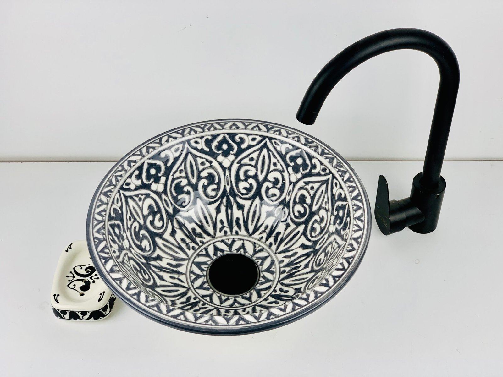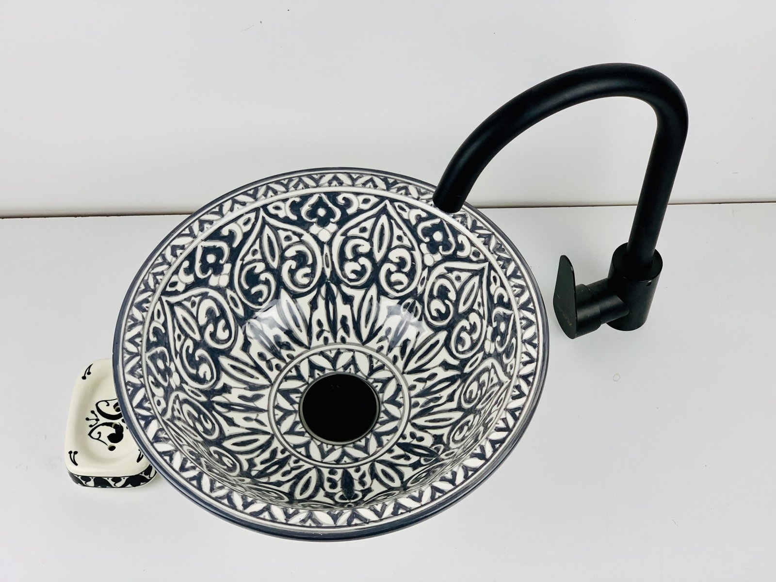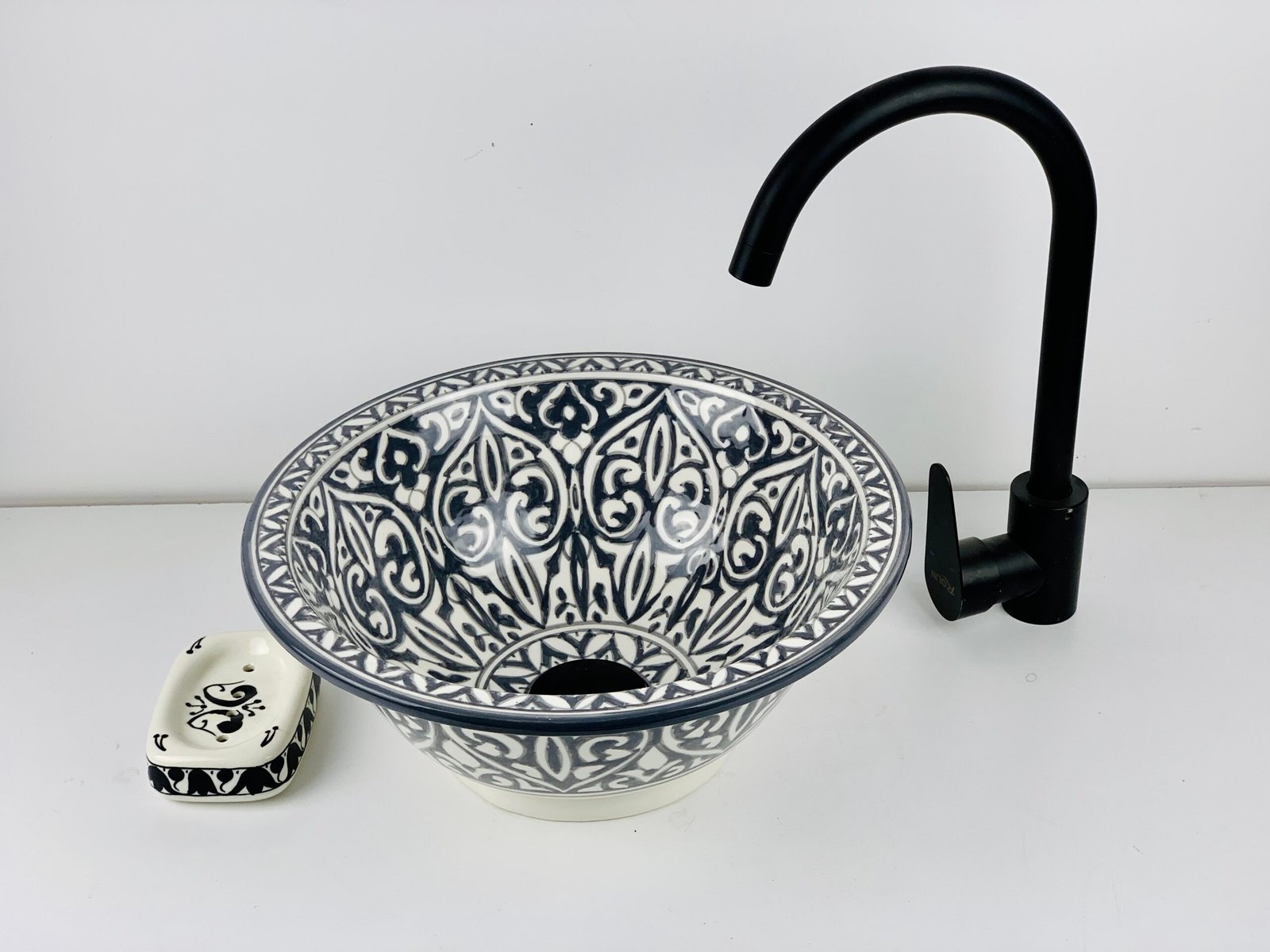 Hand-Painted Ceramic Sink with Brass Rim – Elegant Moroccan Design